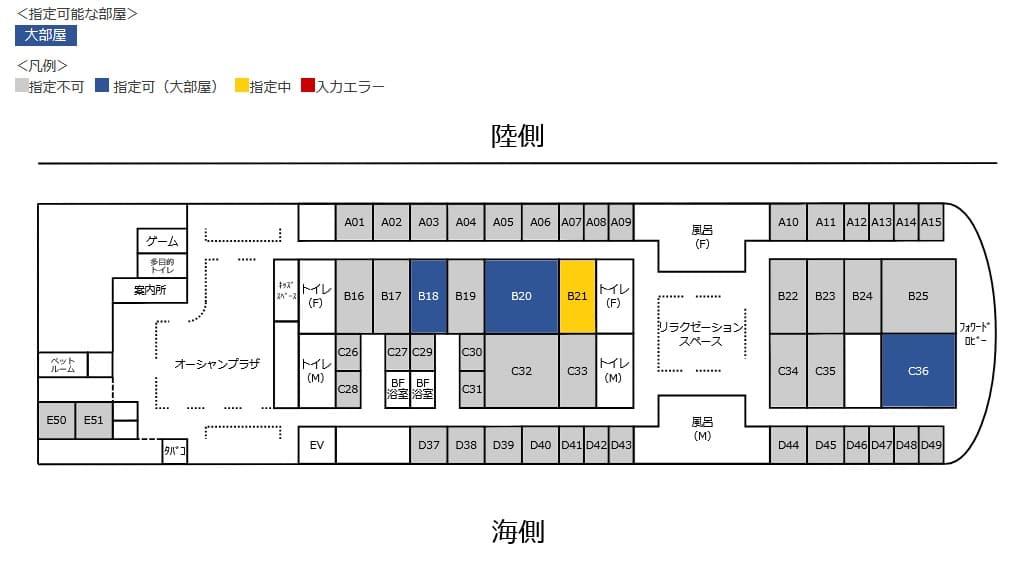 この船のデッキプランはこんな感じ。乗客が利用するのは1フロアのみ。