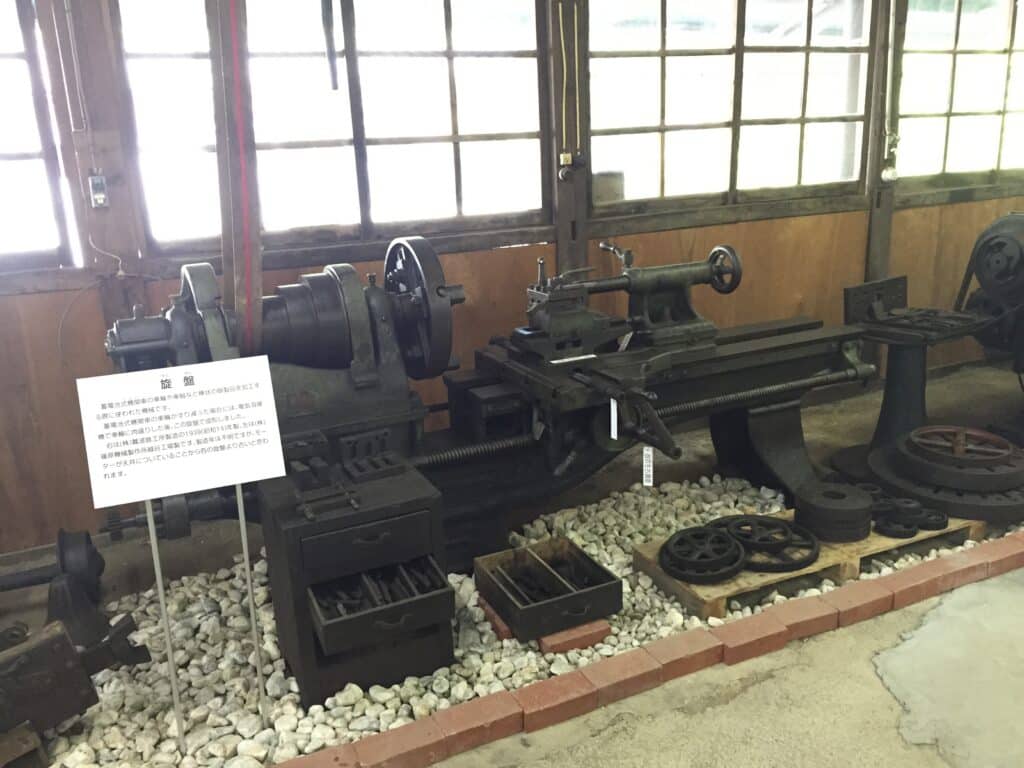 この写真は、佐渡金山の工場にある旋盤(材料をグルグル回して削る機械)ですが、モーターは搭載されていません。